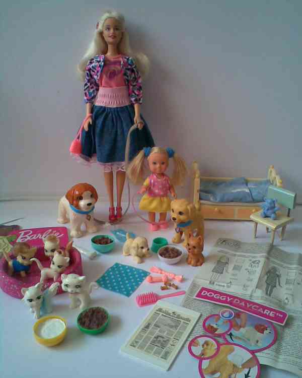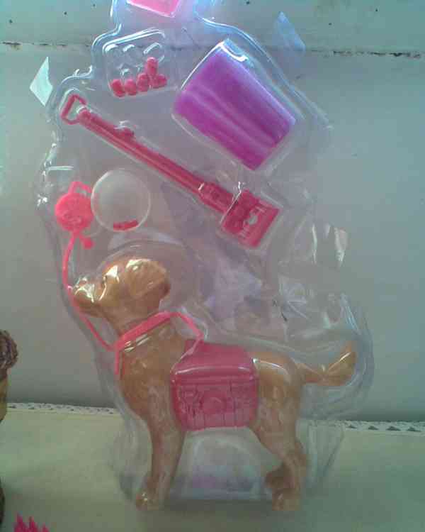 různé panenky, pejsci s funkcemi, kočičky s kamínky v očích, postýlka, židlička, kočárek, koník chodící, různé oblečení