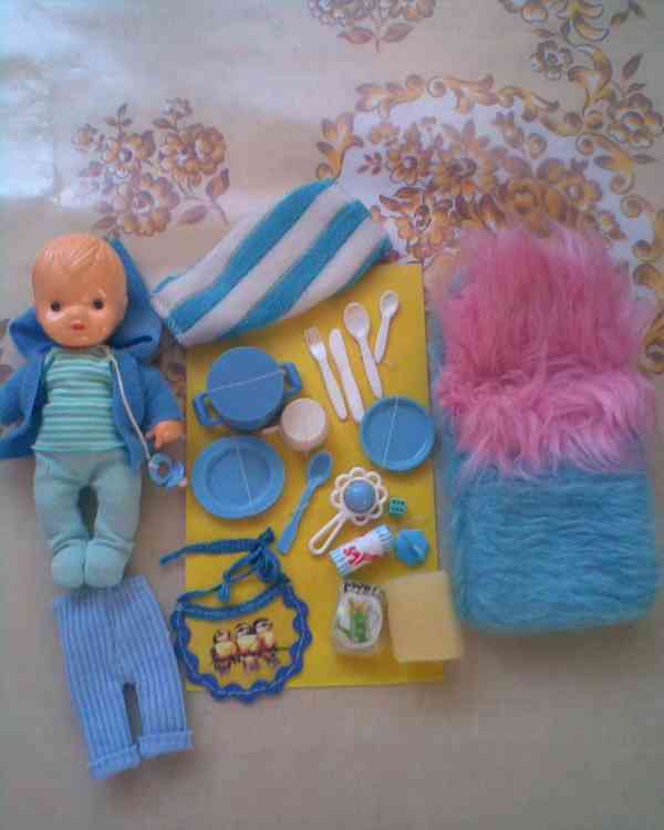 retro Igra panenka s různými doplnky a modrý kočárek, možno přidat i postýlku