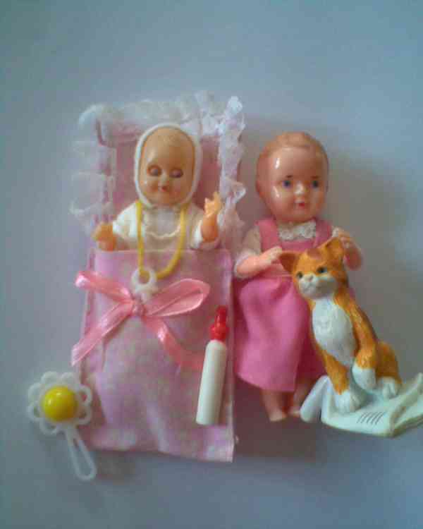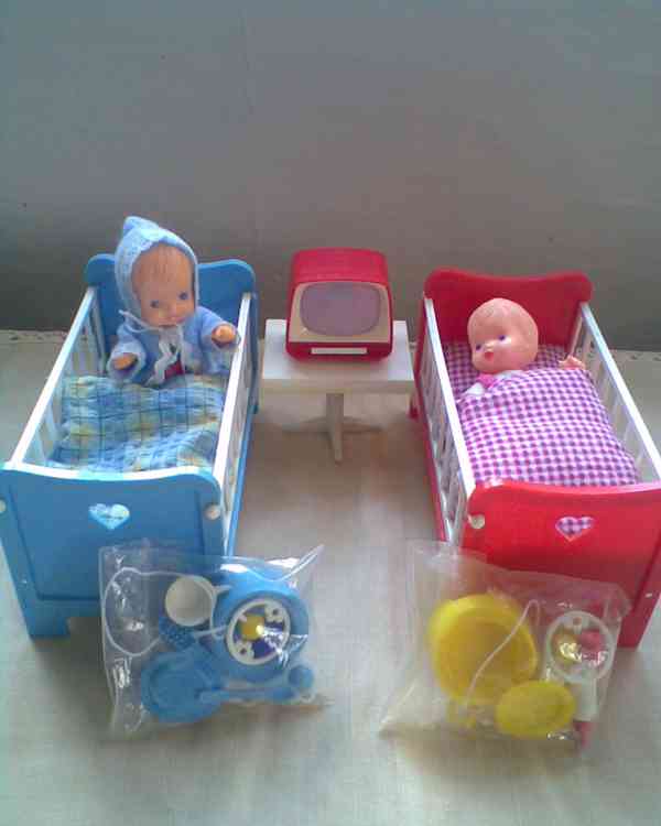 MIMOŘÁDNÁ SLEVA všechno viz foto jen mrkací panenky v obyváku neplatí, počet panenek lze určit a tím i postýlky