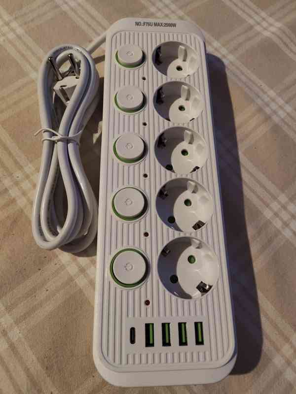 5+4 USB-A + USB-C (PD) + 3 Power switch 2 m , prodlužovací kabel s 2metrovým kabelem, průřezem 1,5 mm² a samostatnými vestavěnými vypínači s indikací na každé zásuvce.