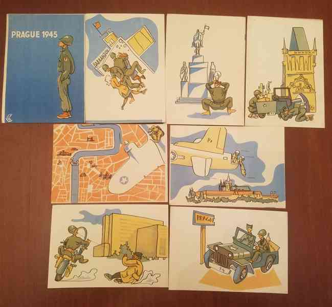 Prodám kompletní soubor - 8 kusů - originálních pohlednic z roku 1945 s námětem Osvobození Prahy americkou armádou se svéráznými popiskami na reversní straně v angličtině. Pohlednice jsou neprošlé, v perfektním stavu. Pohlednice byly připraveny pro vojáky 7. americké armády v případě osvobození jimi Prahy. Kresby signovány Z.B. Osobní předání na Praze 3, nebo zaslání přes Zásilkovnu či Balíkovnu. Volejte 770 630 523, nebo pište na morgiana007@gmail.com