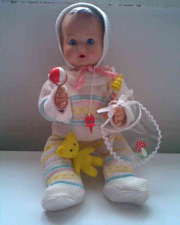 retro krásné celuloidní panenky i se svými doplnky a postýlkou