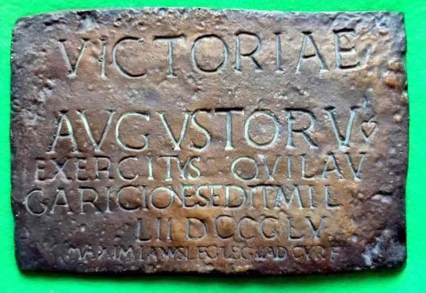 Prodám zmenšenou bronzovou kopii římského nápisu z r.179 n.l. na hradní skále v Trenčíně / Laugariciu, rozměr 19 x 13 x 0,8 cm, 1,6 kg.