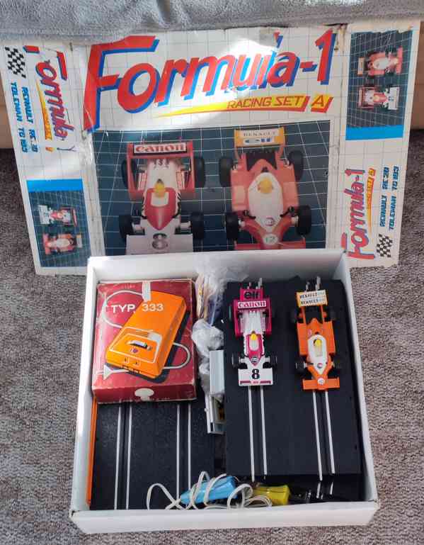 Prodám vzácnou autodráhu s autíčky Toleman a Renault plně funkční včetně trafa. Krabice je opotřebovaná jeví známky používání. Posílám na dobírku nebo osobní předání Most a okolí. Cena 2500. Tel.731 644 706