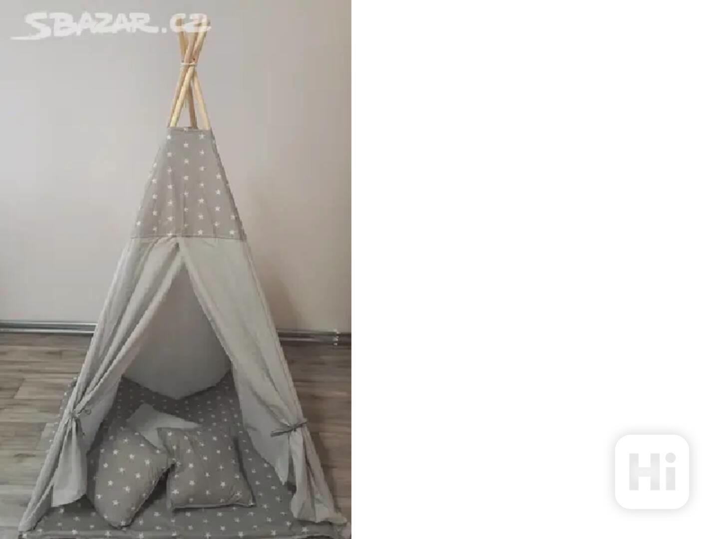Stanový dům pro děti Tipi Wigwam okno polštář šedé hvězdičky. Materiál: bavlna + dřevo; rozměry (délka / šířka / výška): 115/115 / 180cm; tloušťka rohože: ~ 2 cm; tloušťka sloupů: 22 mm; rozměry polštáře (délka / šířka): 27 / 27cm; Hmotnost: 4,4 kg