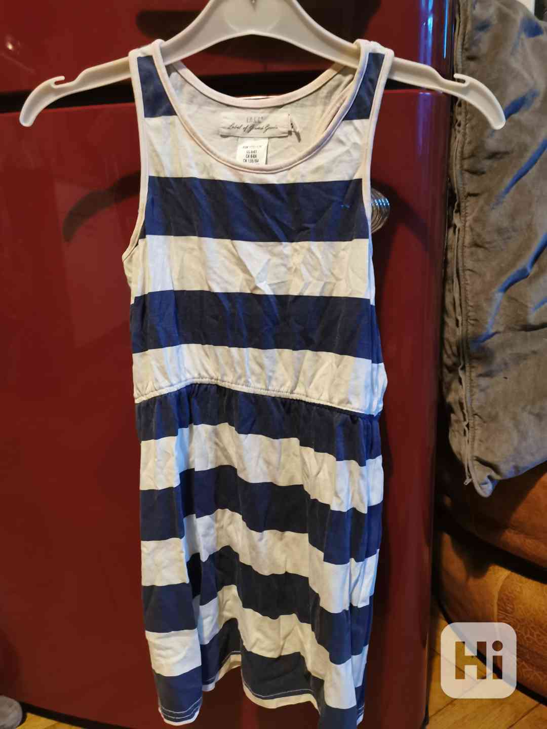 Šatičky vel. 122-128, modro-bílé barvy, zadní délka 63 cm, přes hrudník 2 x 34 cm, v zachovalém stavu bez vad.