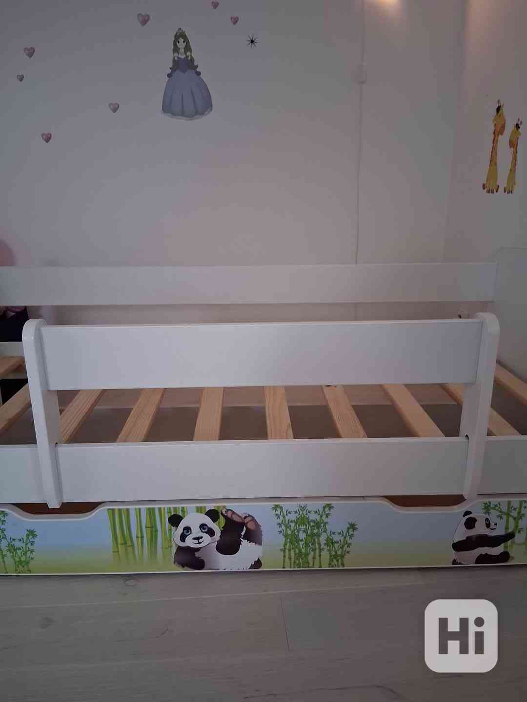 Dětská dřevěná postel s vysunovacím šuplíkem na hračky včetně roštu, matrace, nahradní matrace, 4x prostěradla natahovacího, 1x povlečení. Postel je ve velmi dobrém stavu. Případné oděrky viz foto. Na boku je posunovací mantinel.
