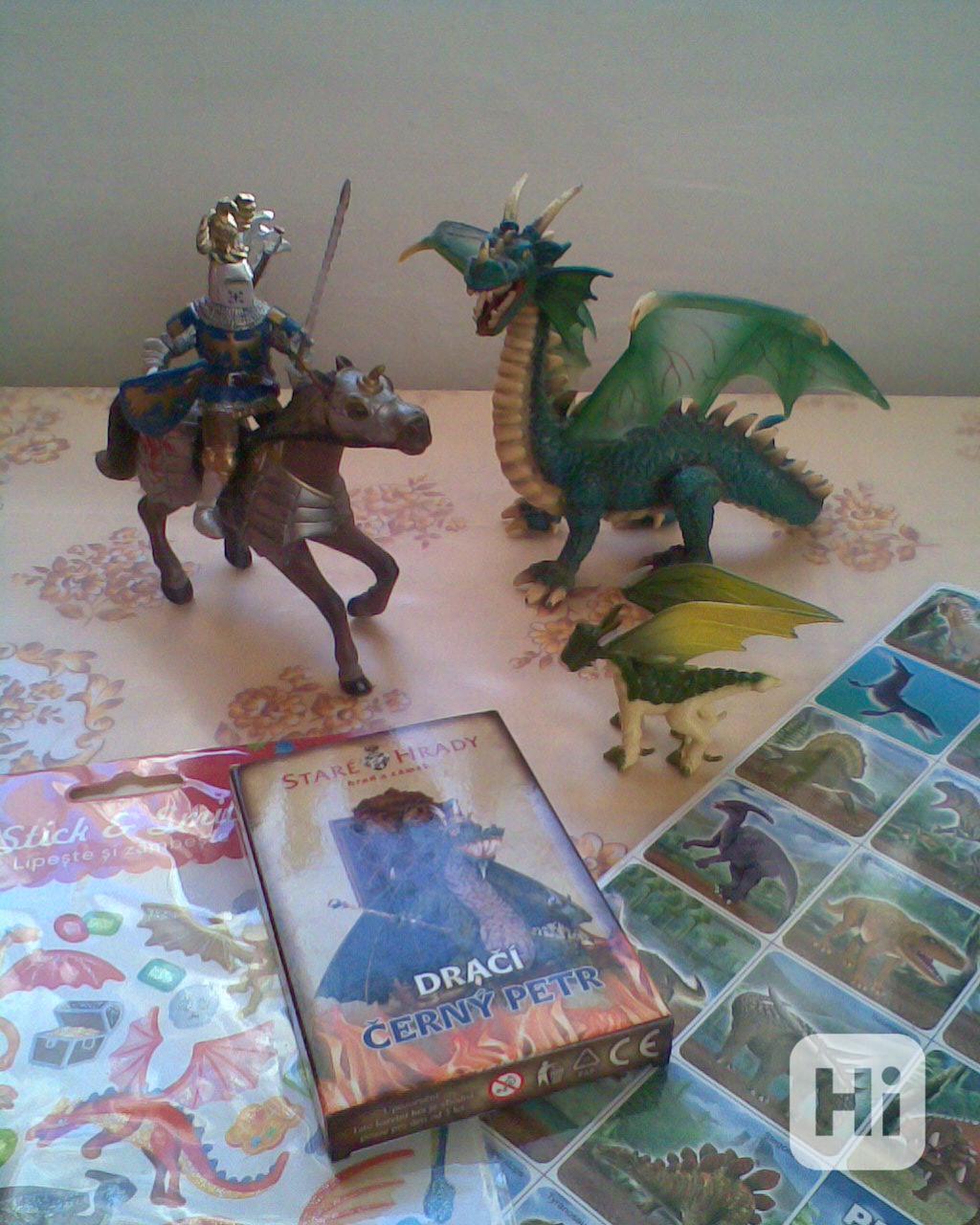 Nový zelený drak s dráčkem, rytíř na koni, dinosaurus, pexeso dinosauři, kvarteto draci, samolepky draci