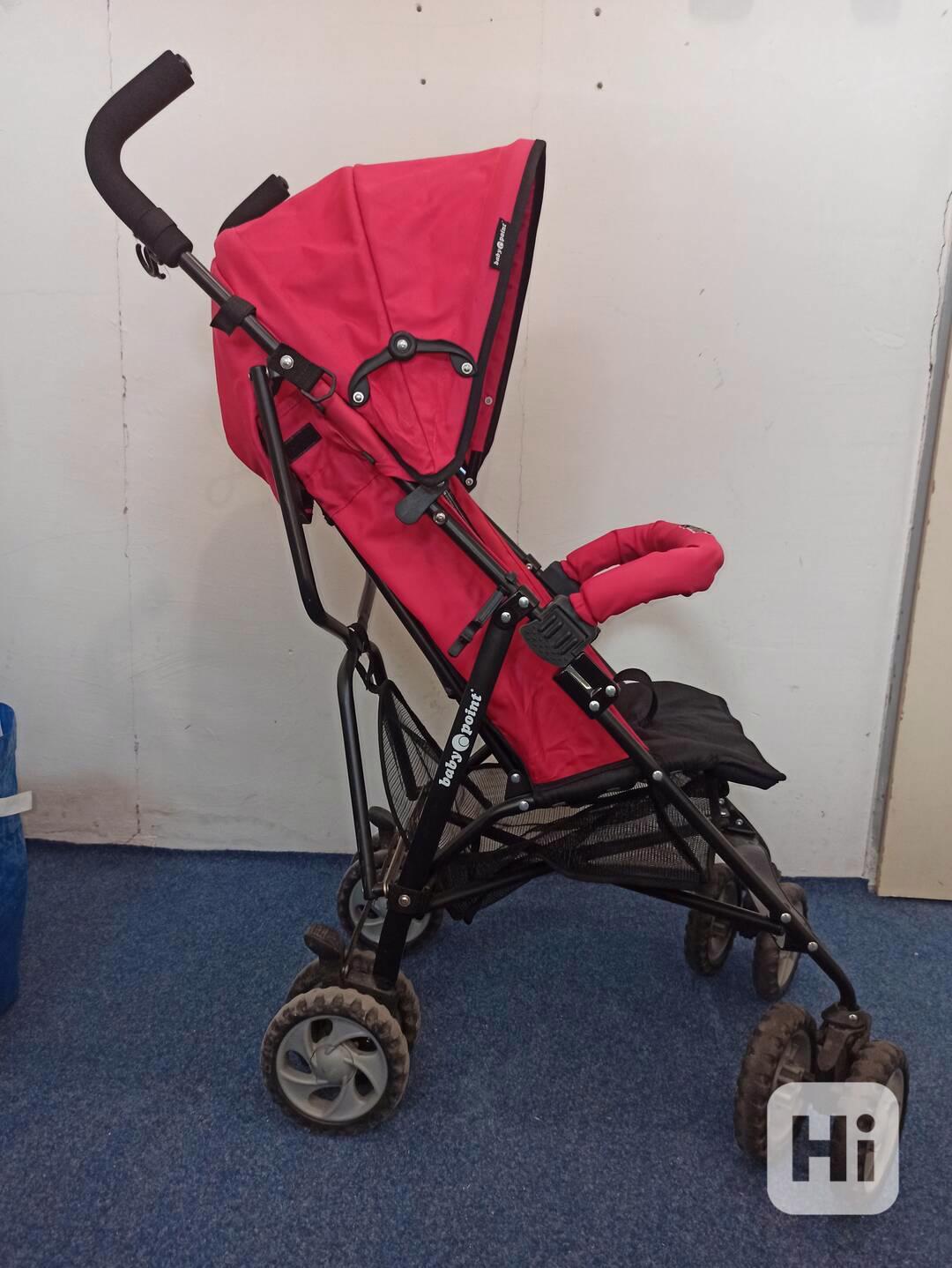 Červený dětský kočárek - golfové hole. Navrženo a testováno v ČR (Státní zdravotní ústav a Strojírenský zkušební ústav). Velmi dobrá složitelnost.