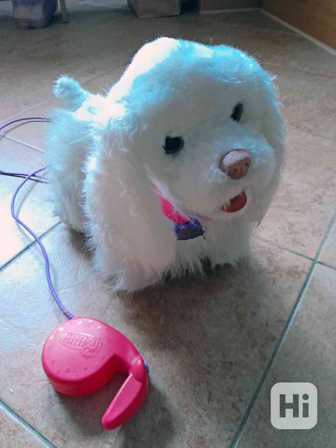 Interaktivní pejsek Gogo. Při chůzi vrtí ocáskem i hlavou a vydává typické štěněčí zvuky. Díky speciálnímu vodítku může dítě s pejskem chodit na procházky. Pejsek je zcela funkční, nepoškozený, jako nový.