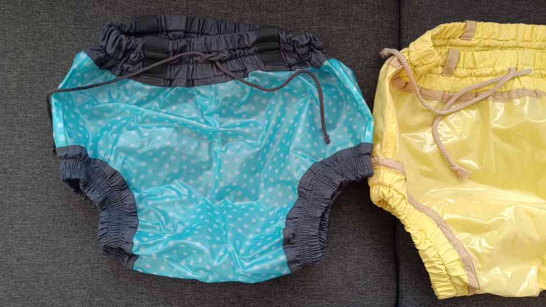 Dvoje pvc kalhotky jsou látka a pvc.A další dvoje pvc kalhoty dvoje jsou dvě vrstvy pvc.Puvodni cena za všechny pvc byla 4400kc,plenky stojí ve zdravotních potřebách asi okolo 600 Kč za balík.Mam dvě balení.