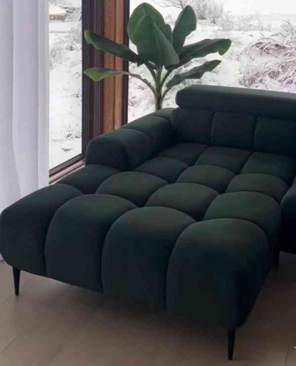 Prodám úplně novou, nepoužitou rohovou sedací soupravu Plaza Mini v elegantní tmavě zelené barvě (potah č. 39) s černými kovovými nožkami. Sedačka je v levém provedení.