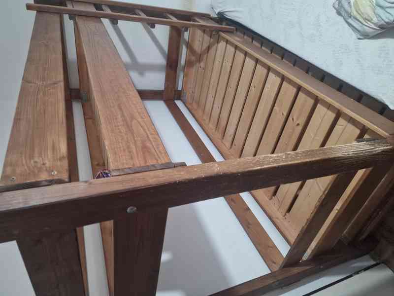 Dětská dřevěná postel s vysunovacím šuplíkem na hračky včetně roštu, matrace, nahradní matrace, 4x prostěradla natahovacího, 1x povlečení. Postel je ve velmi dobrém stavu. Případné oděrky viz foto. Na boku je posunovací mantinel.