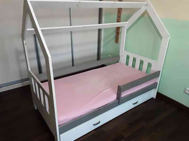 Jedná se o model domeček, který je vizuálně hezký a dětem atraktivní. Pod roštem je praktický úložný prostor ve formě šuplíku na kolečkách, kam lze uložit veškeré náhradní deky, povlečení. Součástí postele je rošt a bezpečnostní zábrana.