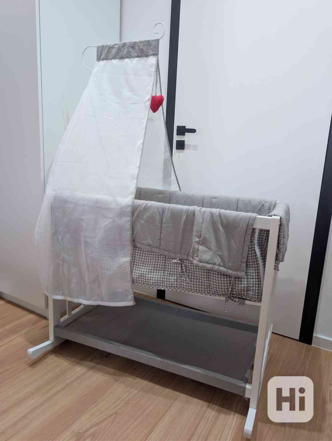 K dispozici jsou nebesa, které může dle potřeby nastavit na levou i pravou stranu případně nevyužít vůbec. Rošt lze polohovat a ovlivnit, tak hloubku samotné postýlky. Ze třech stran je dřevěné žebrování, čtvrtá strana se uzavírá vývazkami textilie + zip. Ve spodní části praktický úložný prostor, například pro pleny.