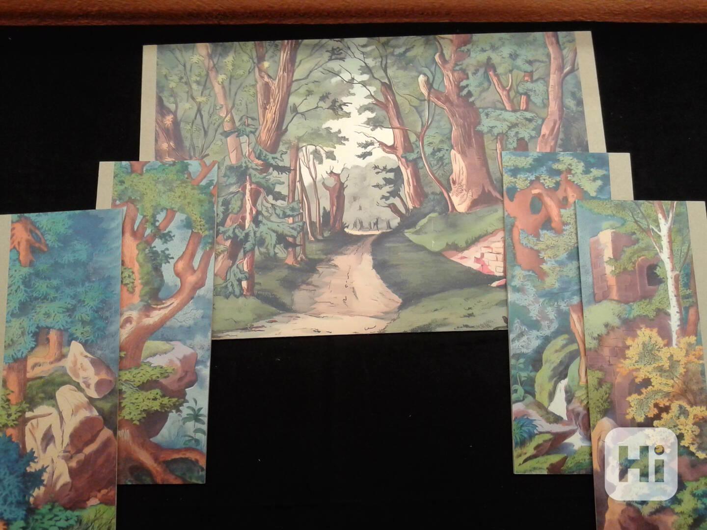 nabízím k prodeji přibližnou rekonstrukci historických loutkových dekorací. (5. sada z vícero) Výška hlavní kulisy 30cm, šířka 45cm. Dekorace jsou oboustranné, na silné knihařské lepence. Ideálně osobní převzetí, při zaslání + poštovné a balné. (Divadlo není součástí nabídky, je možné je vyrobit, nebo poslat návod).