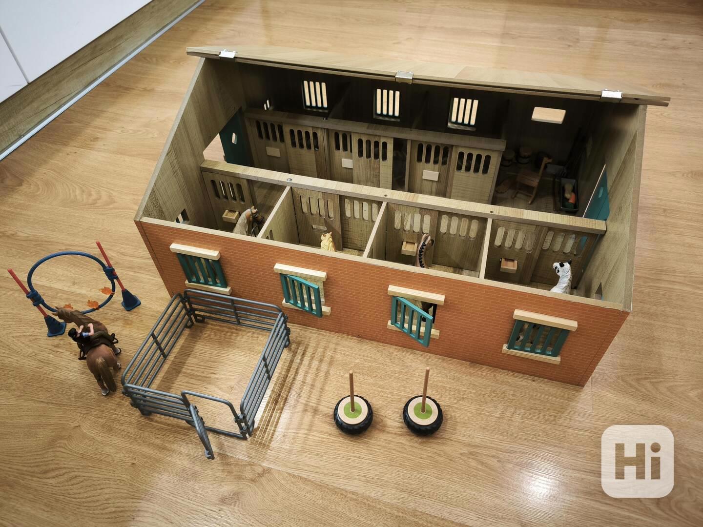 Prodám dětskou stáj na hraní. Stáj má 7 boxů a je vhodná pro koně o velikosti 11-13cm. Rozměry stáje jsou 72,5 x 60 x 37,5 cm. Polovina střechy je odklápěcí, okna a dveře jsou otevírací, dveře boxů jsou posuvné. Součástí je i veškeré vybavení, které je na fotografiích. Stáj je v zachovalém stavu, na některých místech poškrábaná, ale funkční. Některé původní šroubky jsem musel nahradit novými, jelikož už moc nedržely.