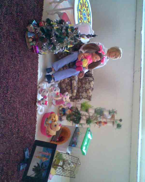 ručně dělaná rozkládací sedačka, květinový stolek, Vánoční stromeček, krb, akvárium, papoušek v kleci, televize, možno přidat panenky, zvířátka
