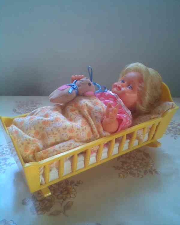 Igra panenka oblečená v peřince v retro dřevěné kolébce s dudlíčkem, chrastítkem, lahvičkou, možno přidat kočárek