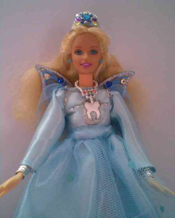 SLEVÁÁÁ panenka Zoubková víla s pohádkovou knížkou o Zoubkové víle v které je pytlíček na vypadlý zoubek a dárek od víly zlatá mince na památku, hrající skřínka plná různých drobností gumičky, sponky, korálky, prstýnky, náramek, řetízky s přívěsky, aj., samolepky a nažehlovačka na tričko, pro holčičku sukénka, čelenka, křídla, šatičky vel. 120, svítící hůlka, rukavičky
