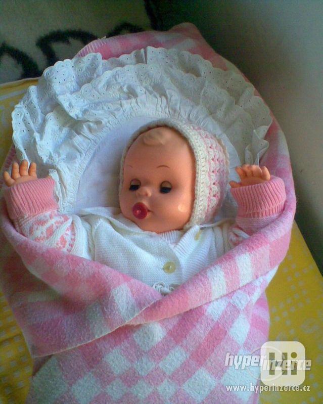 mrkací plačící panenka v retro oblečení, zavinovačce, dece, má dudlík, chrastítko, pískací hračku, botičky