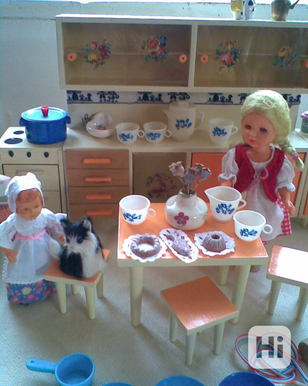 Retro kuchyňka, panenka, nádobí s jídlem pro panenky