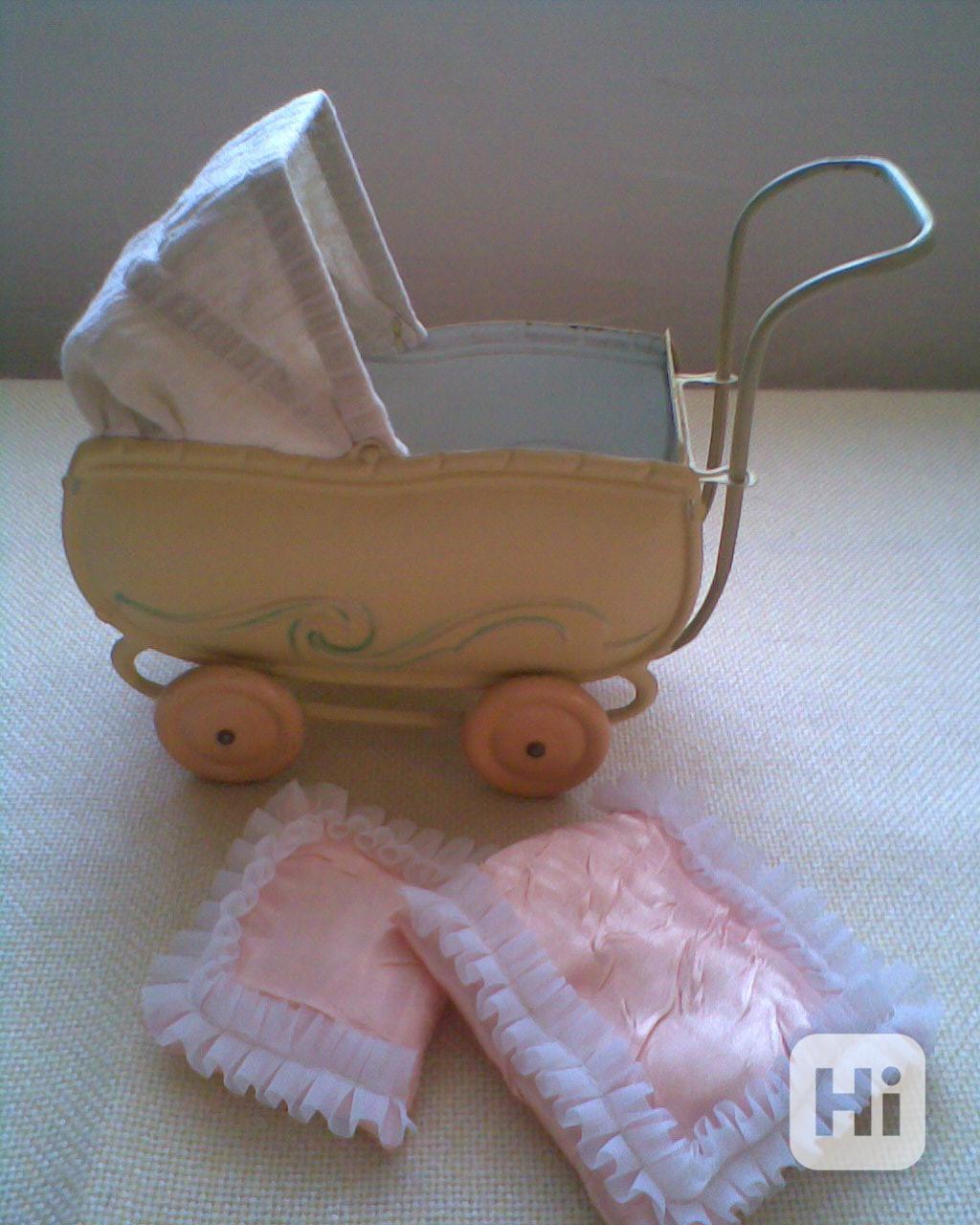 retro kočárek po renovaci s peřinkami, panenkou, stojící panenkou, postýlka s peřinkami, Anděl