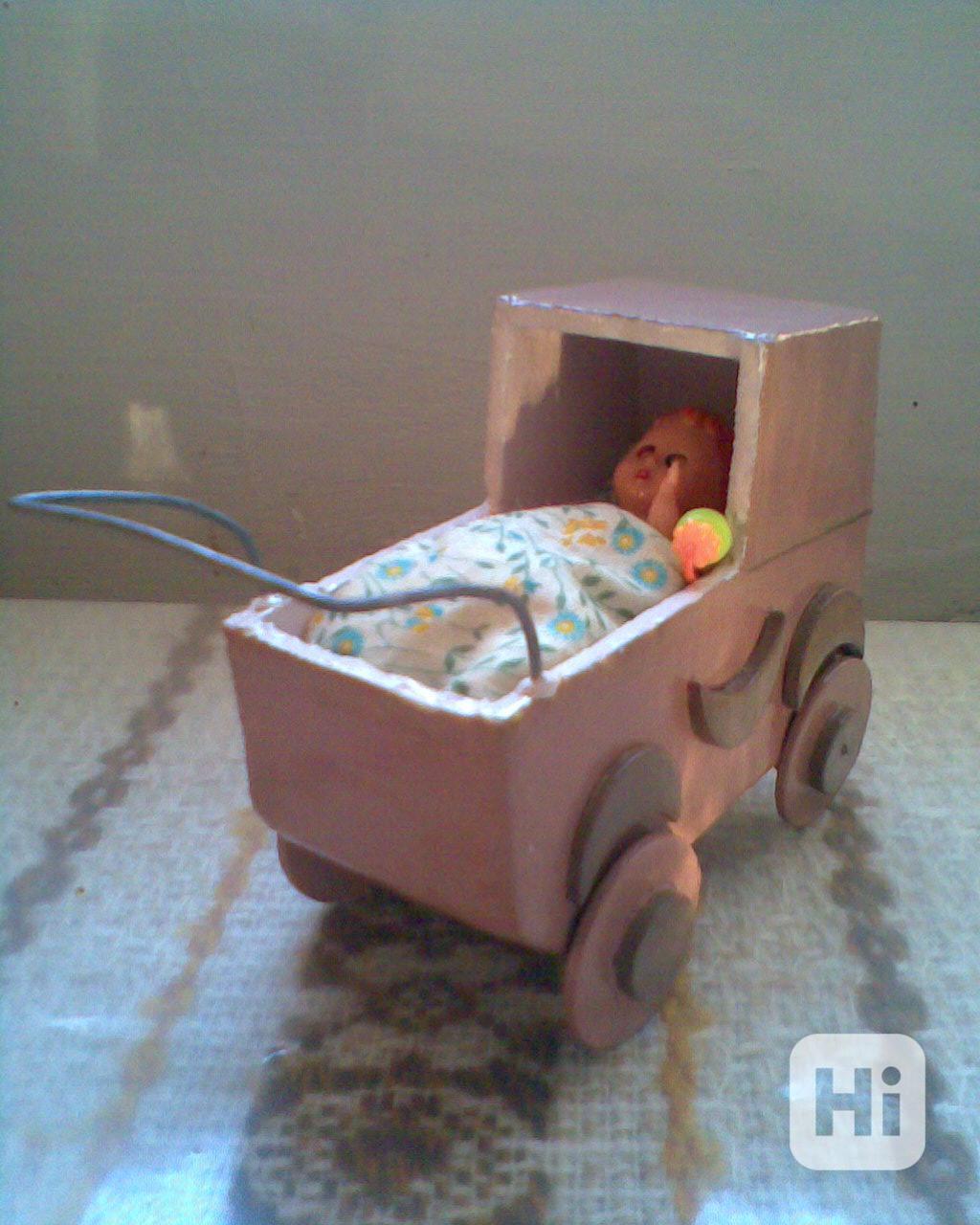 retro dřevěný kočárek po renovaci s peřinkami a panenkou