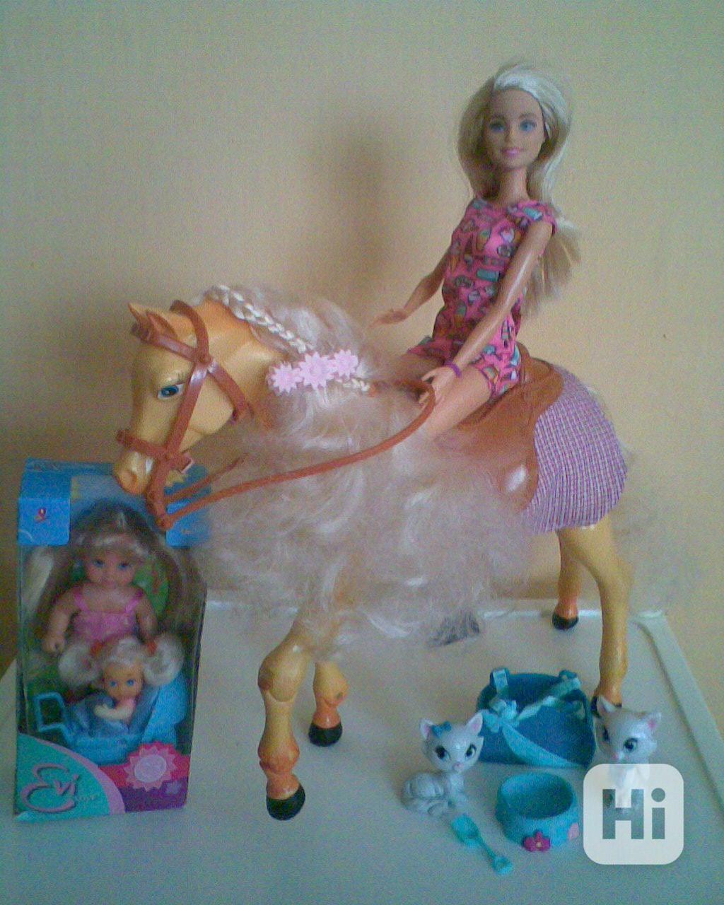 Barbie, Ken (vyberte si bud blond nebo tmavého), dvě různé Evičky, kočárek s panenkou, kočičky, pejsci, chodící koník, postele, rozkládací sedačka, krb, akvárium, papoušek, květinový stojan, malířská sada, televize, Vánoční stromeček, stůl a židle, nádobíčko, možno zdarma Vánočně zabalit