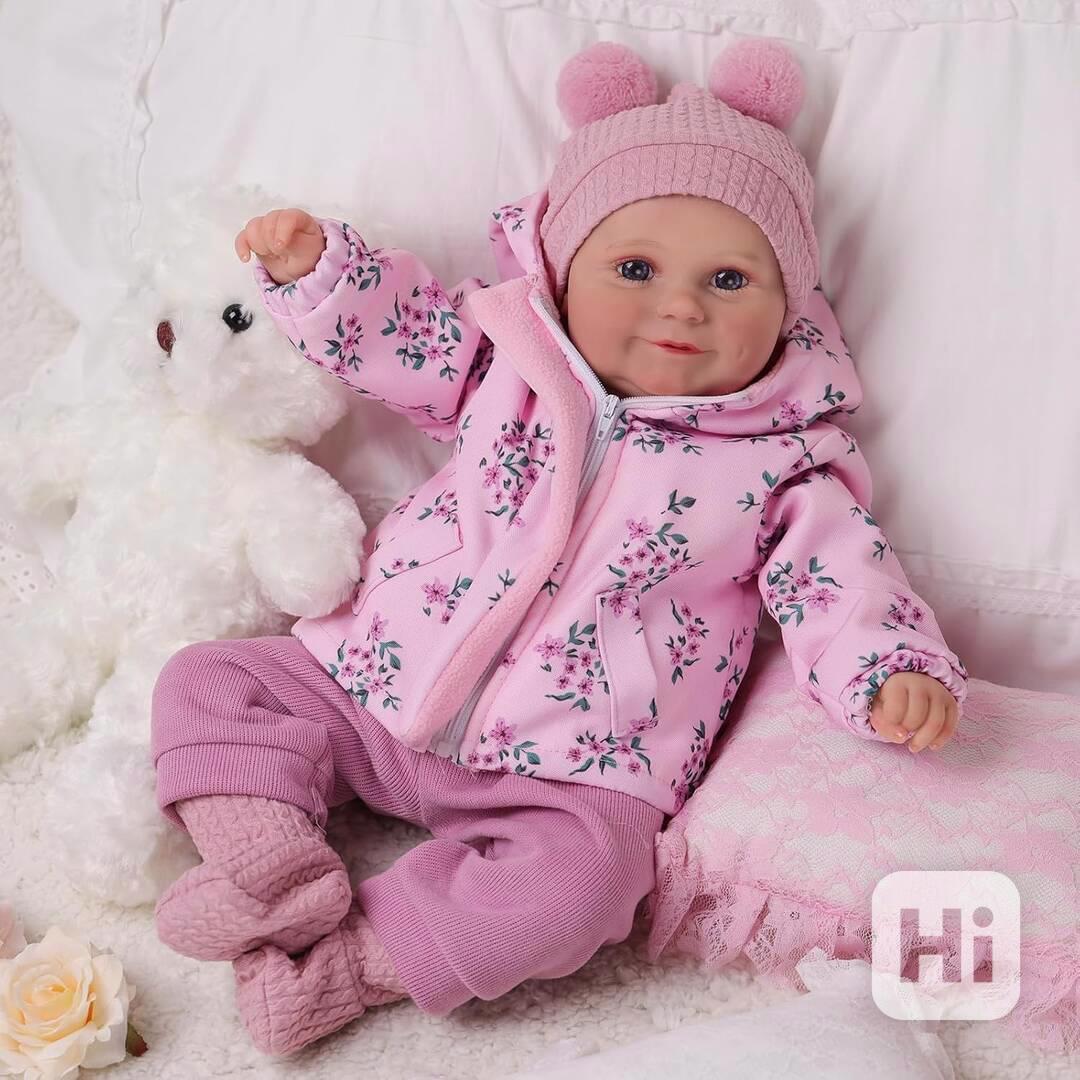 Nabízím 50 cm velkou realistickou panenku s modrýma očima, milým úsměvem, látkovým tělíčkem, malovanými vlásky, dudlíkem na magnet, lahvičkou, chrastítky, rodným listem na vyplnění.