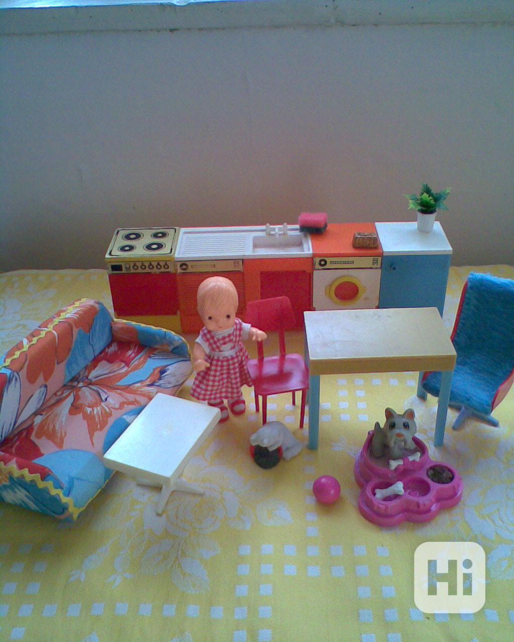 kuchyn, nádobíčko, dvě Igra panenky, Evička, pokojíček, obyvák, pejsci, kočičky, akvárium