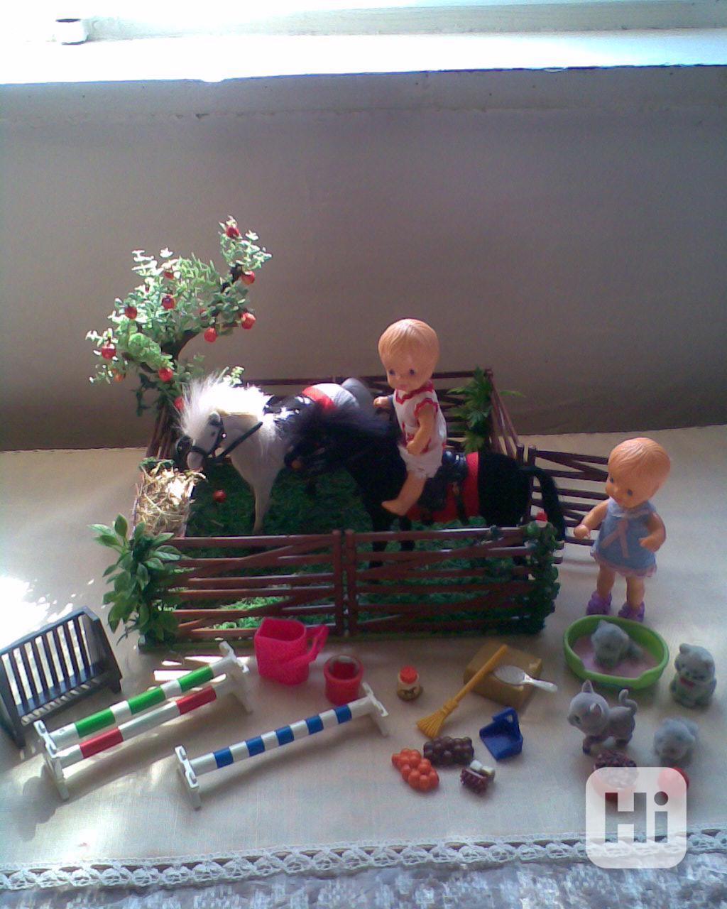 nový koníci s ohrádkou zahrádka, s doplnky, dva vozíčky, panenky, samo jezdící hrající auto, zvuk při hraní lze vypnout