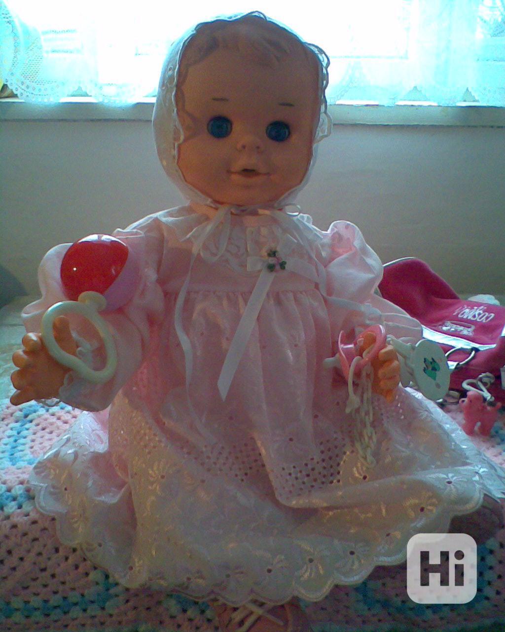 pěkná panenka mrkací, plačící s mluvící lahvičkou, dudlíkem na řetízku, sadou s nočníkem, dekou, je v novém oblečení a další na převlečení, možno přidat postýlku s peřinkami, sadu lékařských nástrojů, chrastítka, pískací hračku,