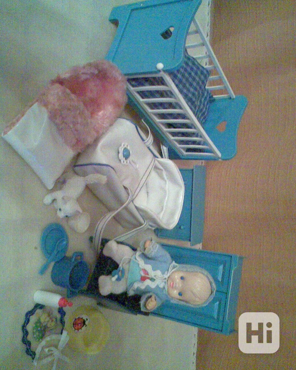 Dvě Igra panenky s pokojíčkem a kuchynkou, přenosná taška, vanička s nočníkem, možno přidat nádobíčko, obyvák, další postýlku