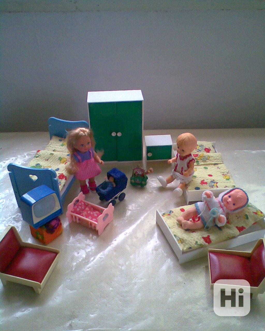 retro pokojíček s doplnky, kuchynka s nádobíčkem a doplnky, koupelna s doplnky, obyvák s doplnky,- panenky v obyváku neplatí, panenek je celkem 5 - tři Igra, Evička a mrkačka, zahradní posezení, pískoviště, koně se zahrádkou a doplnky, kočičky, pejsci, akvárium, terárium, papoušek, jezdící auto, vozíčky, kočárky, bazén,