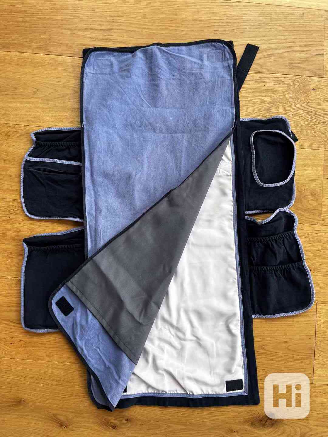 Praktická přebalovací podložka o rozměrech 38 x 85cm v rozloženém stavu. Sbalená jen na velikost 18 x 25 x 8cm. Obsahuje 4 kapsy a také dvě objímatelné podložky, které jsem ještě podšila kočárkovinou.