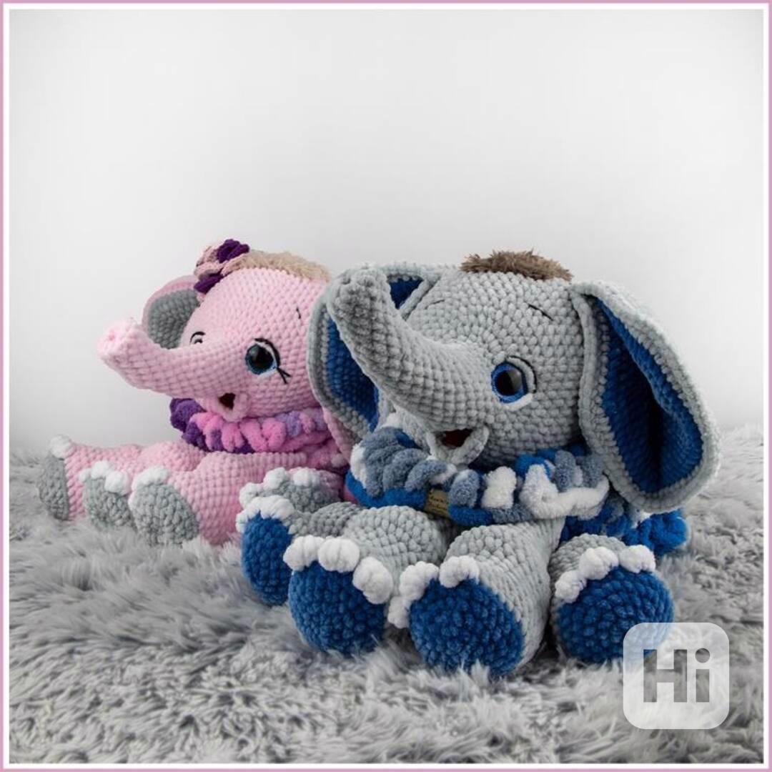 Pyžamožroutek sloník Kubík a Klárka, háčkovaní z plyšové - žinylkové vlny, velmi příjemní na pokožku. Z žinylkové vlny se dělají deky pro miminka do kočárku nebo do postýlky.