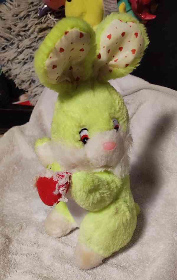 Srdíčko s nožičkami, výška cca 13 cm. Uvnitř se strojkem, bohužel už nepovídá (nezkoušela jsem rozpárat a kouknout dovnitř, zda se dá vyměnit baterka).
