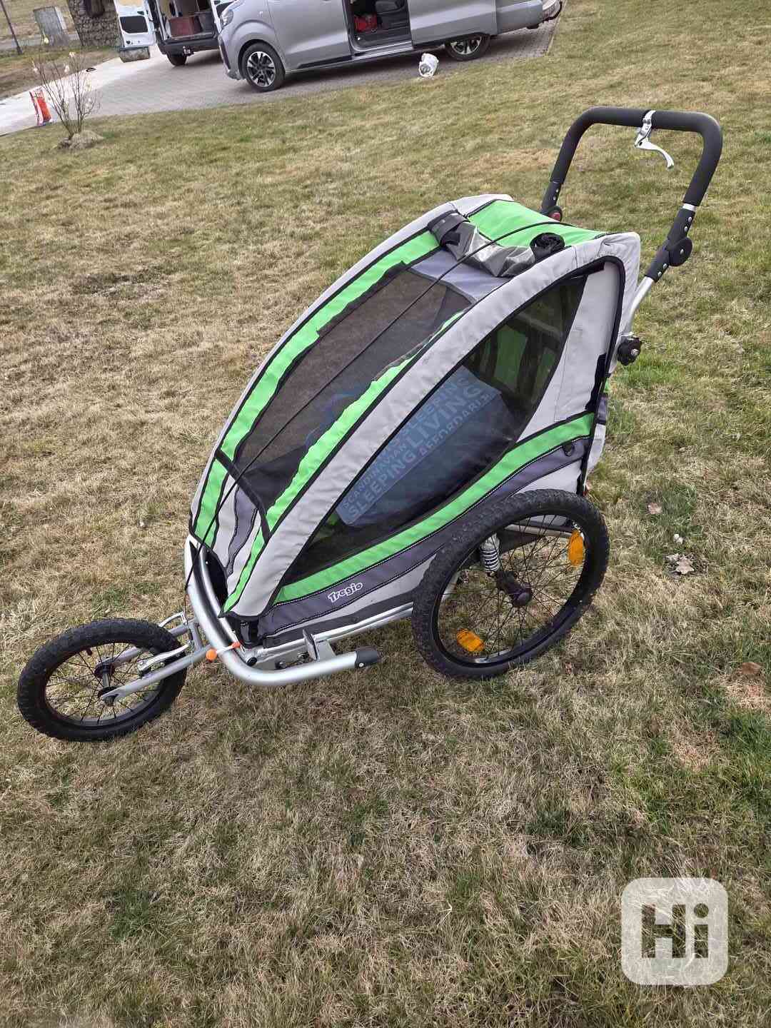Prodám dětský kočárek (vozík)-trojkolku TREGIO. Hliníkový rám, reflexní pruhy, odrazky, tyč za kolo (uložená pod kočárem), úchyt za kolo, madlo, praporek, brzda na přední kolo, odpružení, úložná kapsa na drobné věci. Podle výrobce vhodný pro děti od 1 do 6 let s max.hmotností dítěte do 35 kg. Využití jako kočár k chůzi, za kolo, na brusle a běhání. Jedině osobní odběr. (Fotka s bílým pozadím je ilustrační z původního shopu). Při rychlém jednání a prodeji do 4.4.2026 prodám za 1000 Kč.